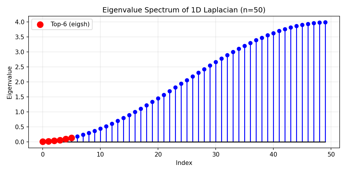 Eigenvalue spectrum of 1D Laplacian (n=50). Red points show the 6 smallest eigenvalues computed by eigsh().¶