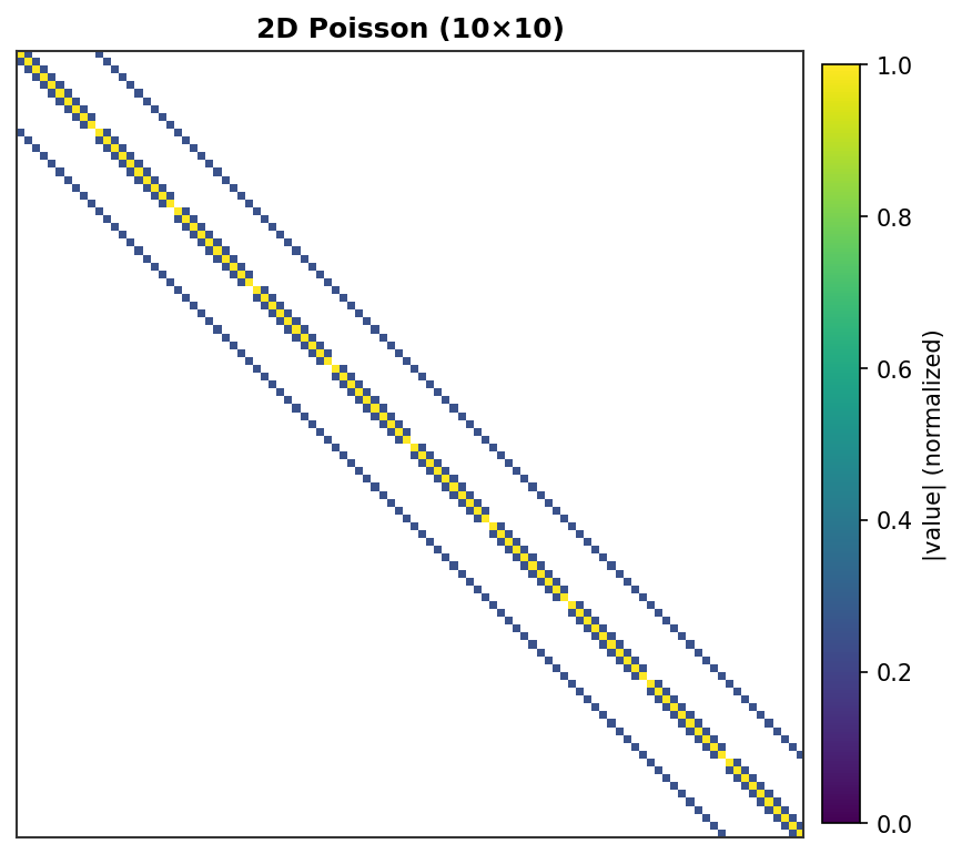 2D Poisson (10×10) - 100 DOF, 5-point stencil with grid lines¶ |