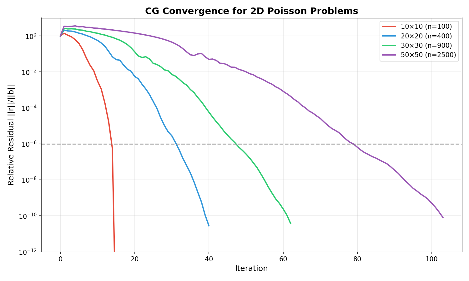 直接求解器 (LU, Cholesky):精确解,稀疏情况下 \(O(n^{1.5})\)