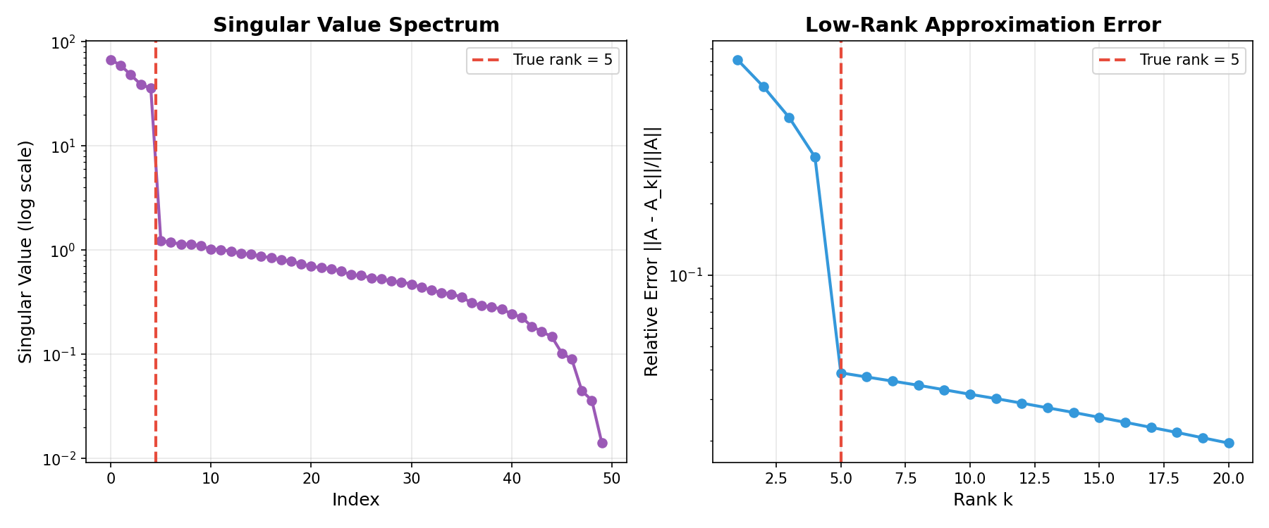 左:奇异值谱显示真实秩后的快速衰减。右:近似误差随秩增加而减少。¶